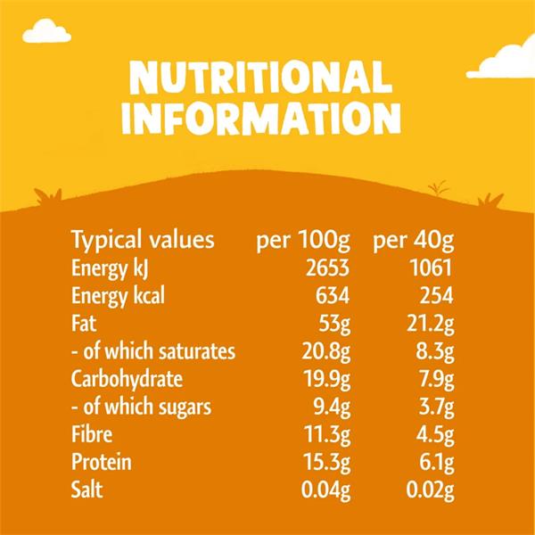 Coconut (28%), Almonds (25%), Sunflower Seeds (20%), Pumpkin Seeds (8.5%), Organic Coconut Blossom Nectar (7%), Chicory Root Fibre (4%), Pecans (3%), Cashews (2%), Linseeds (1.5%), Chia Seeds (1%)