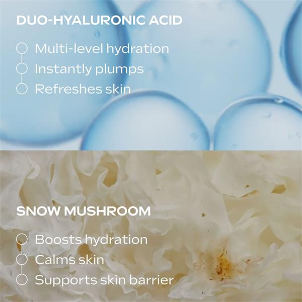 Quench your skin with nature's deepest hydration. This lightweight, fast-absorbing serum delivers both immediate and long-lasting hydration, helping to plump the skin, smooth fine lines, and restore a fresh, dewy glow. Snow mushroom, celebrated for its ability to hold up to 500 times its weight in water, works in harmony with skin-identical hyaluronic acid to support the skin barrier and lock in moisture.